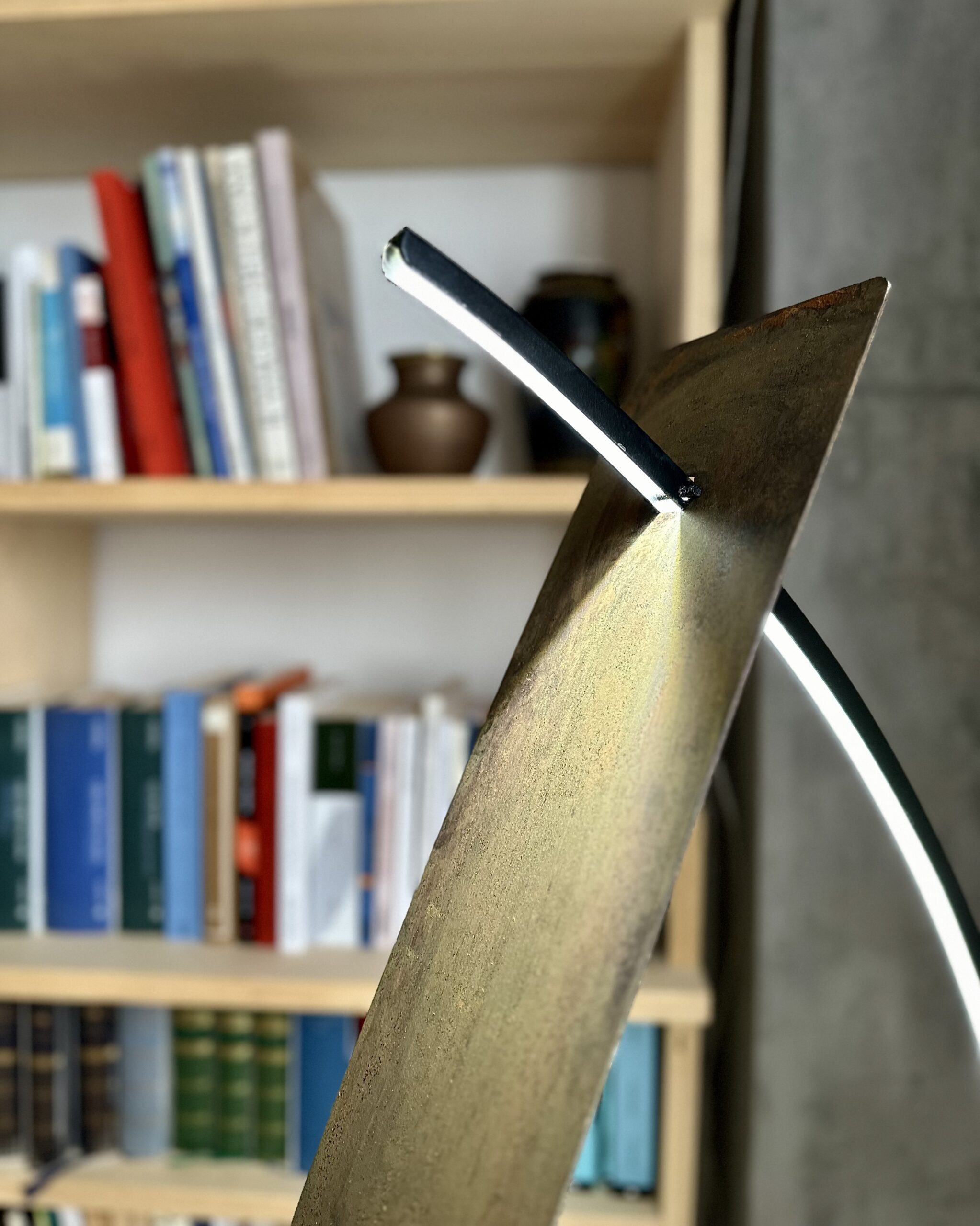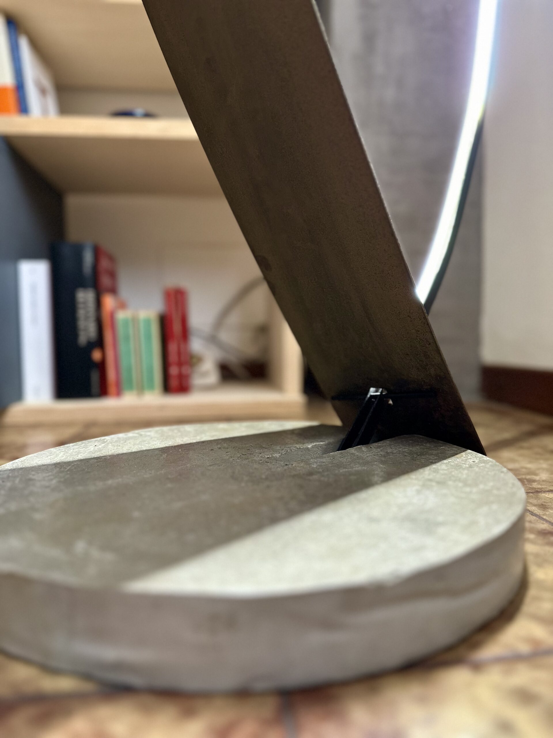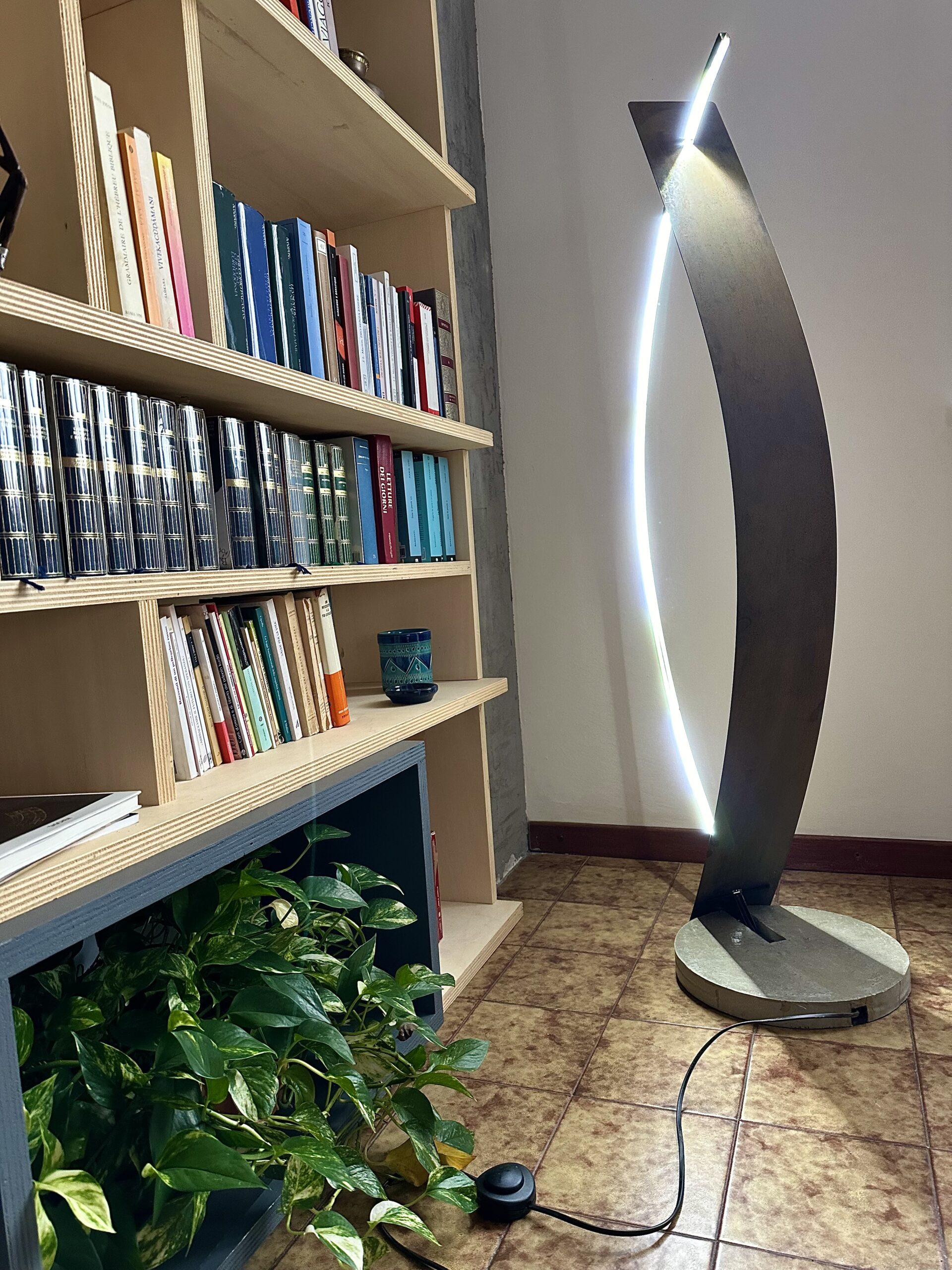 Questa lampada esprime un perfetto equilibrio tra forma, materia e luce. Il profilo in ferro piegato definisce una struttura leggera e fluida, mentre la lamiera in corten, ricercata e materica, riflette la luce del LED con delicatezza, creando un gioco di riflessi e ombre che valorizza gli spazi. La base in cemento, solida e calibrata, ancora la lampada al suolo, bilanciando l’insieme con precisione.
