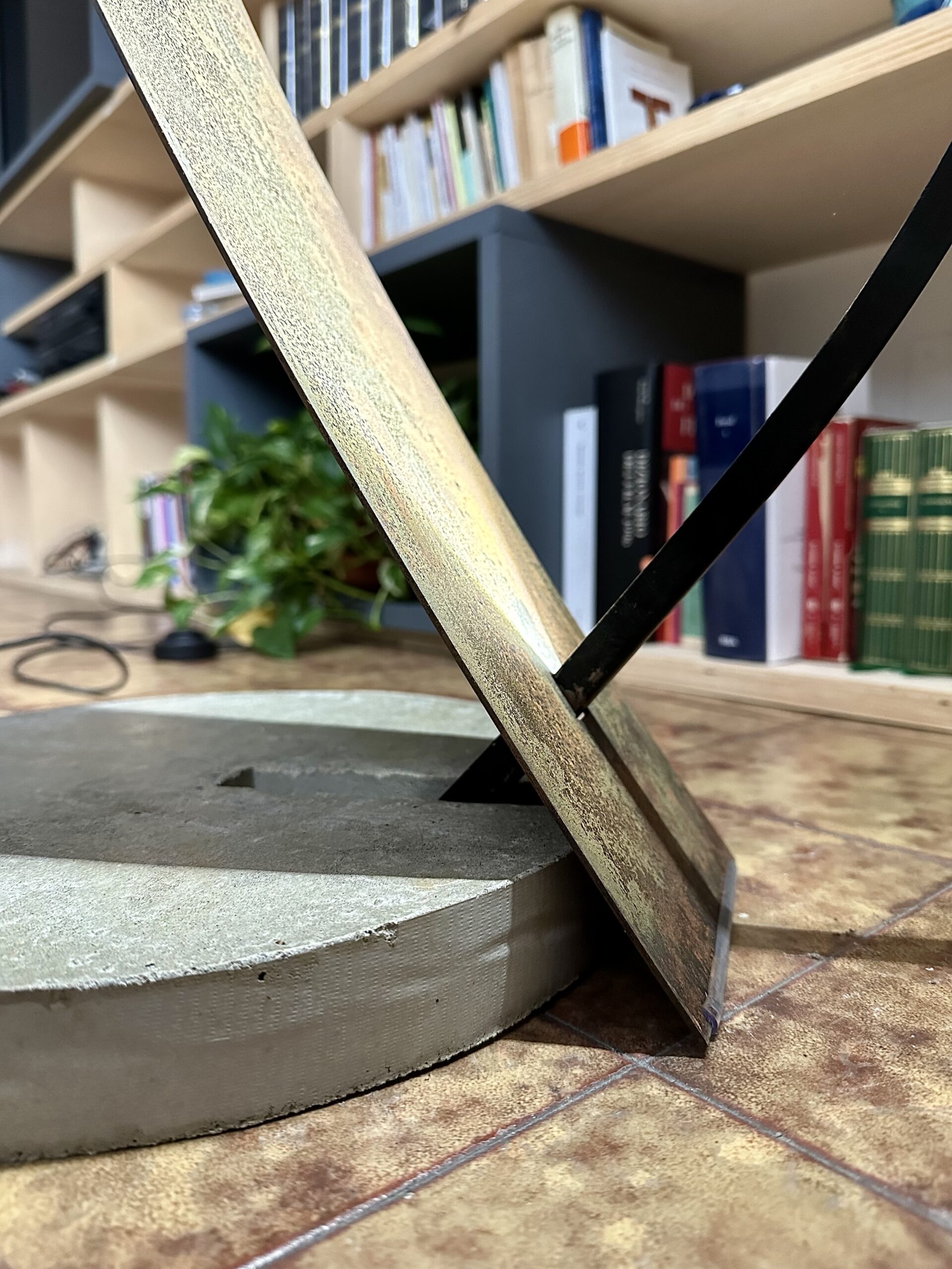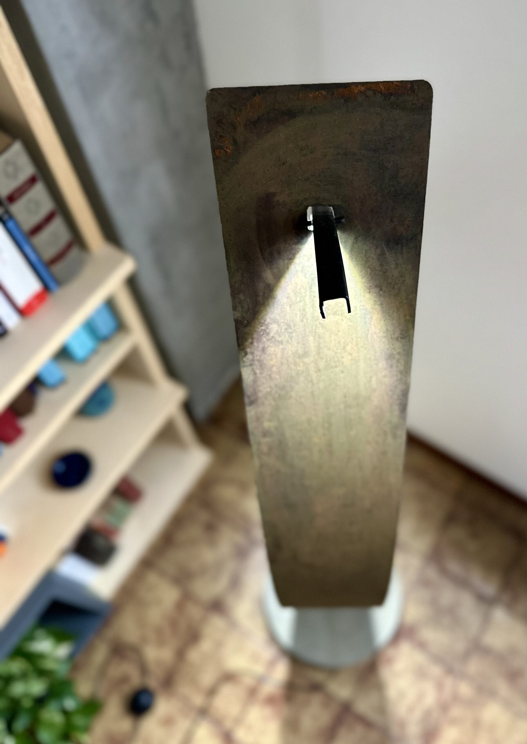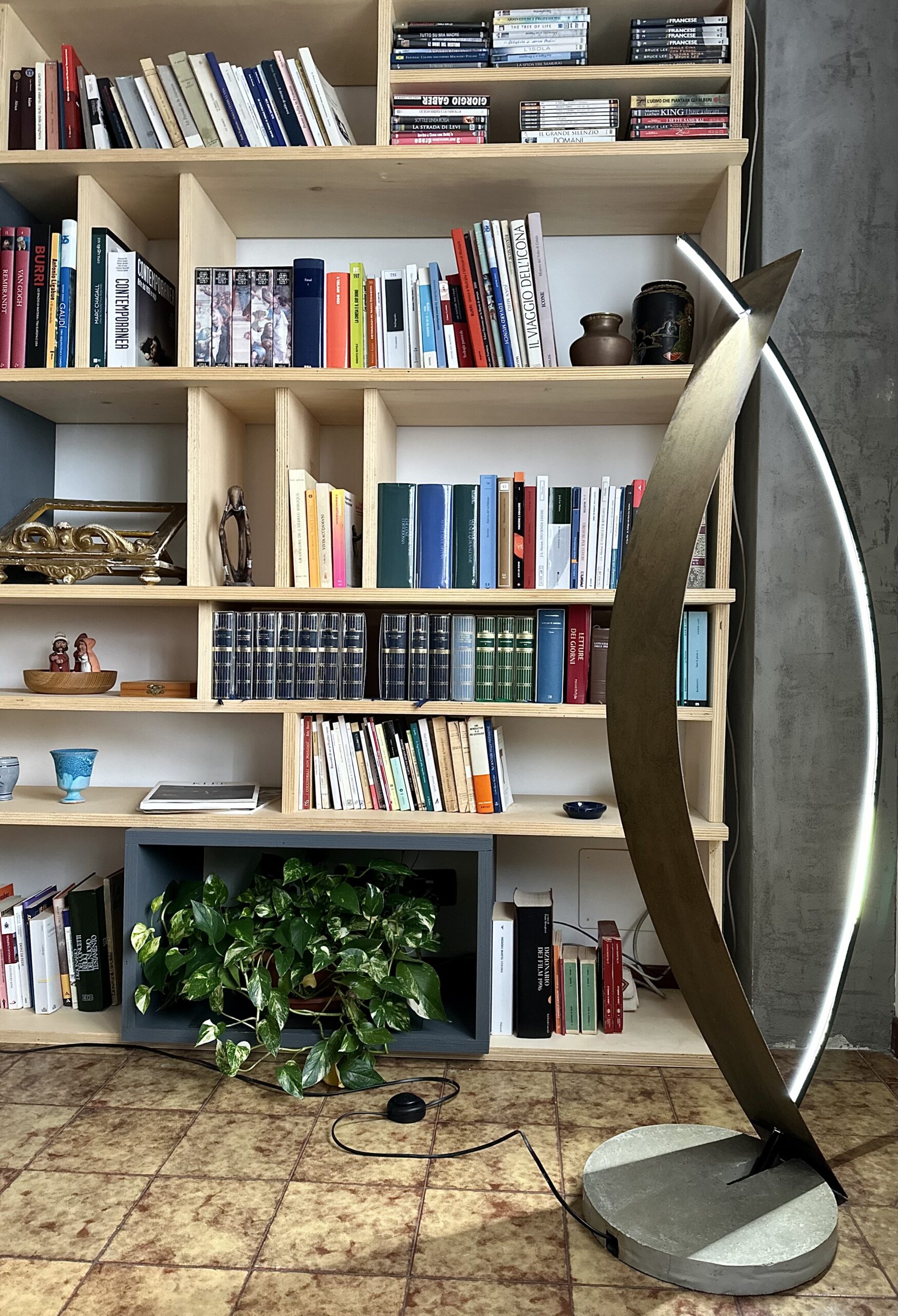 Questa lampada esprime un perfetto equilibrio tra forma, materia e luce. Il profilo in ferro piegato definisce una struttura leggera e fluida, mentre la lamiera in corten, ricercata e materica, riflette la luce del LED con delicatezza, creando un gioco di riflessi e ombre che valorizza gli spazi. La base in cemento, solida e calibrata, ancora la lampada al suolo, bilanciando l’insieme con precisione.