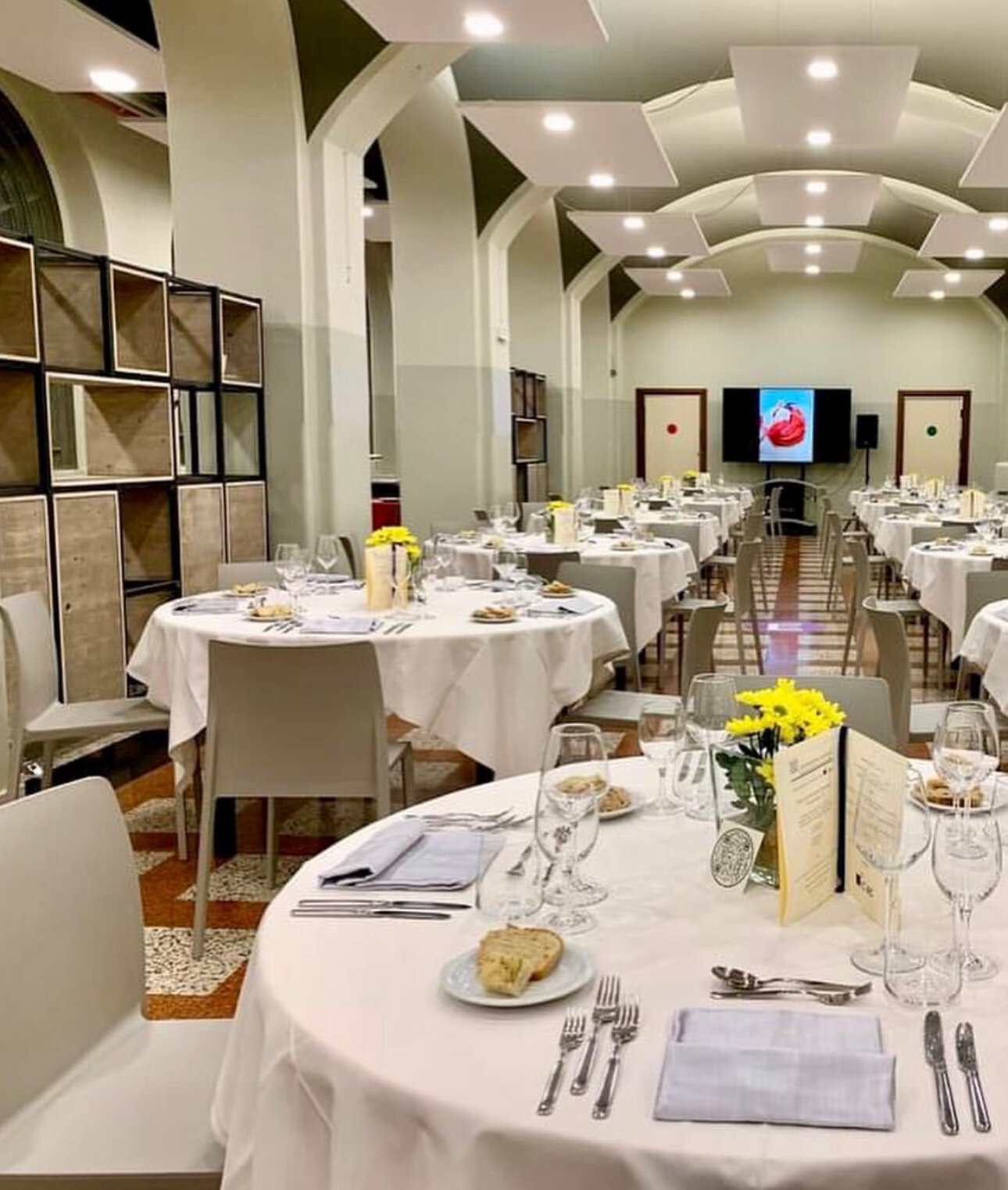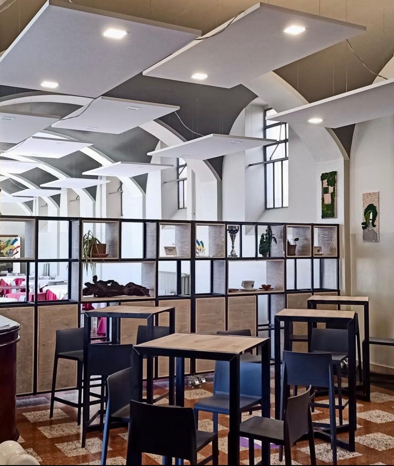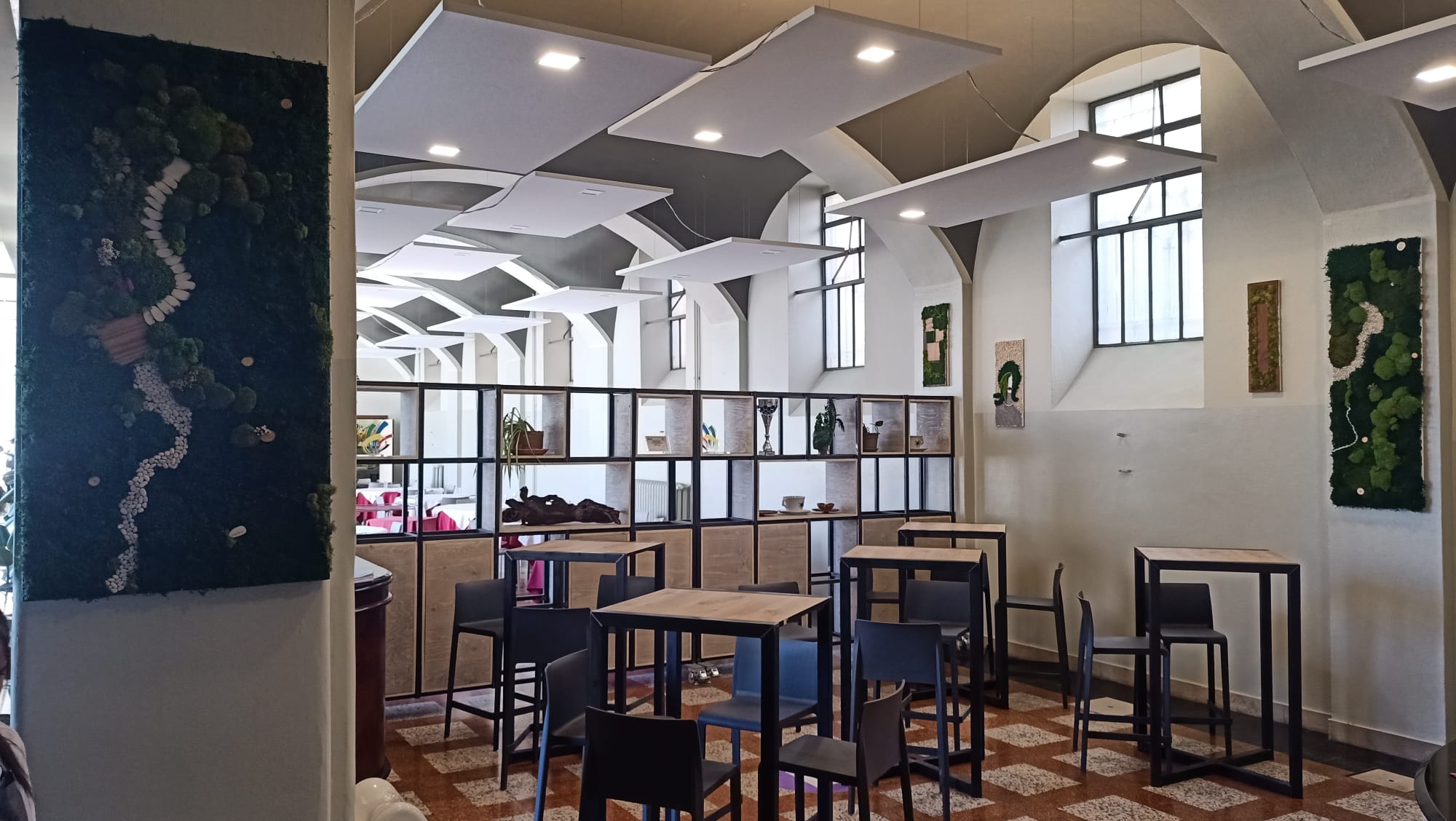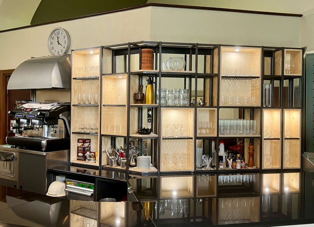 Di giorno accoglie l’energia della didattica, trasformandosi la sera in un ristorante rinomato. L’estetica industrial diventa protagonista grazie all’utilizzo di materiali come il ferro, le griglie forate ed il legno, che dialogano armoniosamente con l’architettura dell’ambiente. Le pareti divisorie removibili creano giochi di spazi dinamici, mentre i tavoli dalle linee essenziali, le altezze calibrate per gli aperitivi e la stagera illuminata aggiungono carattere e funzionalità. Questo stile dona all’ambiente un’identità decisa ma accogliente, capace di interpretare al meglio le diverse anime dello spazio.