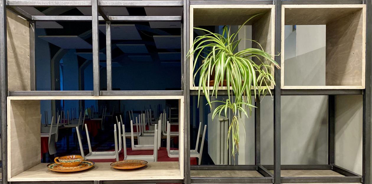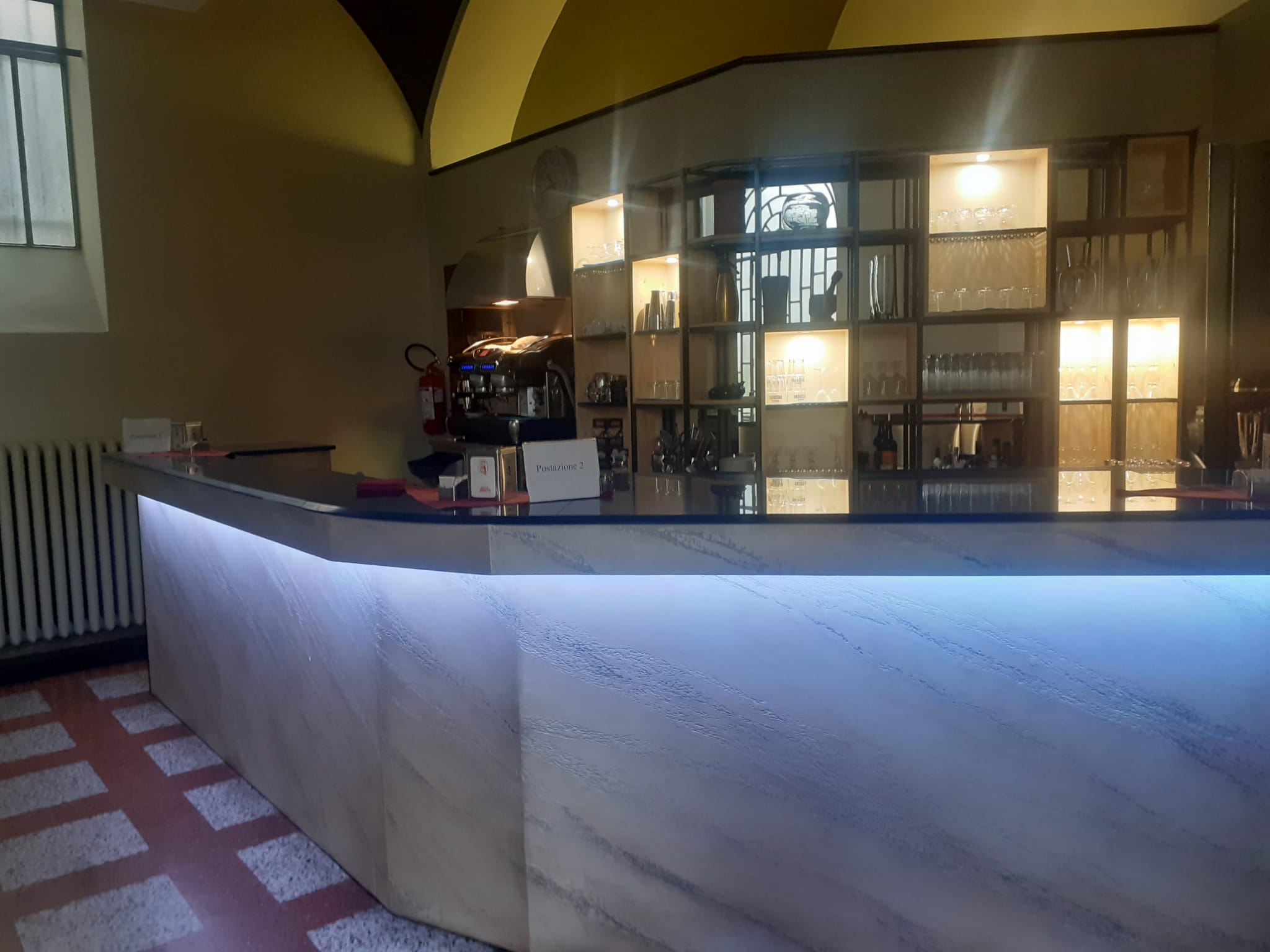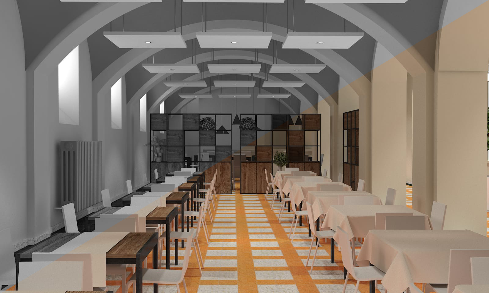 Di giorno accoglie l’energia della didattica, trasformandosi la sera in un ristorante rinomato. L’estetica industrial diventa protagonista grazie all’utilizzo di materiali come il ferro, le griglie forate ed il legno, che dialogano armoniosamente con l’architettura dell’ambiente. Le pareti divisorie removibili creano giochi di spazi dinamici, mentre i tavoli dalle linee essenziali, le altezze calibrate per gli aperitivi e la stagera illuminata aggiungono carattere e funzionalità. Questo stile dona all’ambiente un’identità decisa ma accogliente, capace di interpretare al meglio le diverse anime dello spazio.