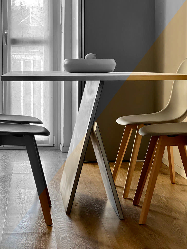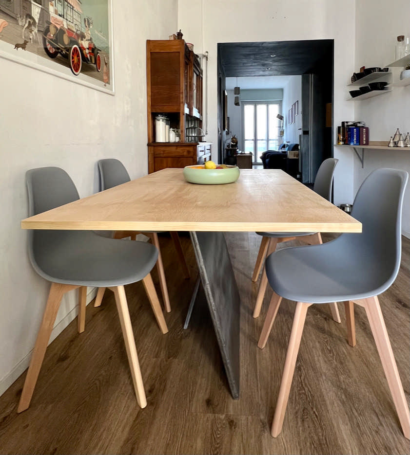 Vertical limit è un tavolo realizzato su misura in lamiera d’acciaio e betulla.