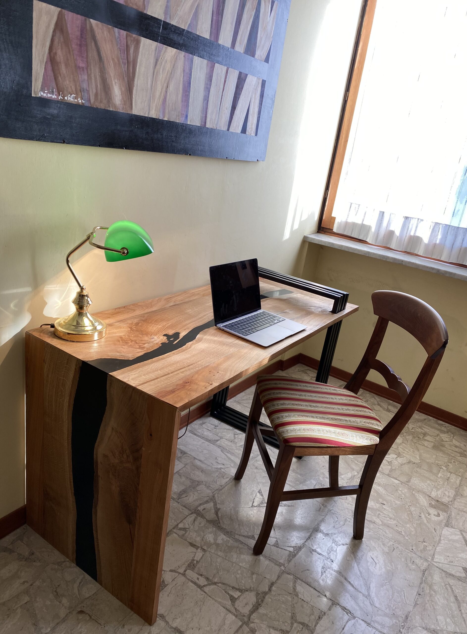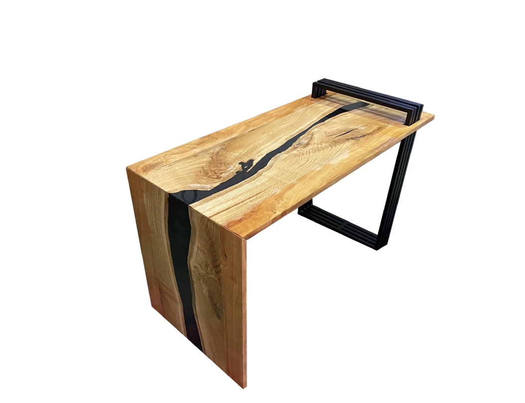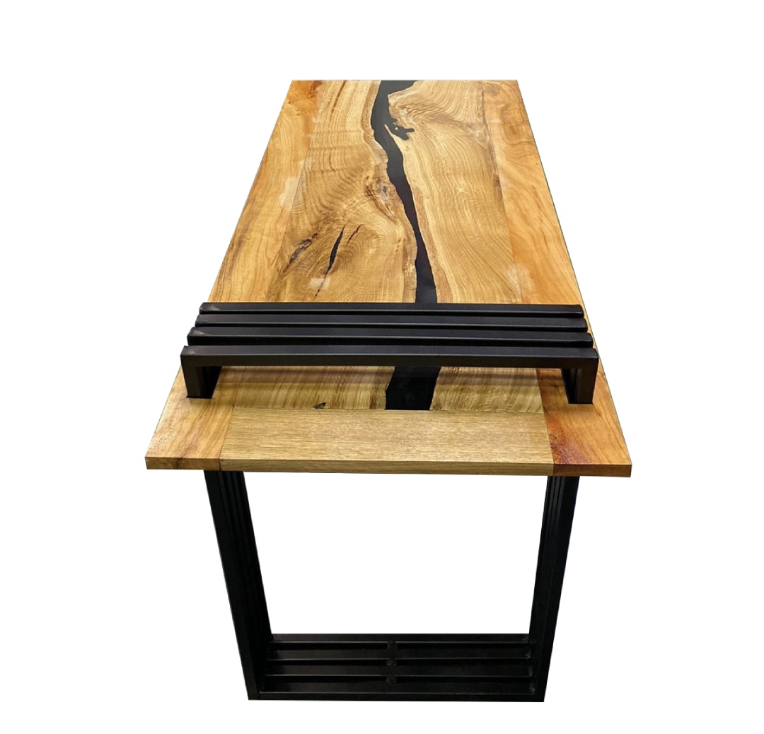 Nella versione con resina, il design si arricchisce di un inserto nero lucido che percorre il piano come un fiume incastonato nel legno. Questo dettaglio straordinario enfatizza le venature naturali e rende ogni pezzo unico, trasformando le imperfezioni in protagonista. Un’opera di design pensata per spazi moderni che ricercano eleganza, personalità e autenticità.
