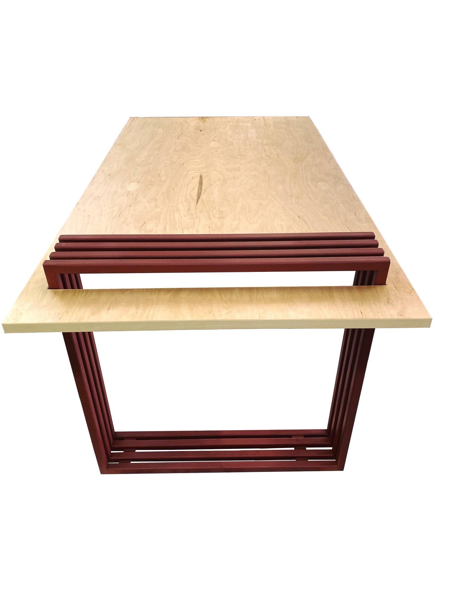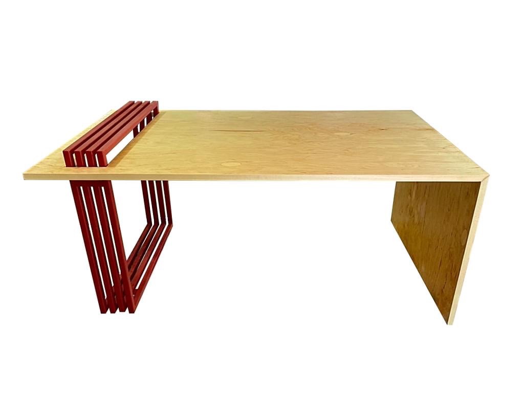 Questo tavolo in multistrato di betulla celebra l’incontro tra legno e metallo, dando vita a un dialogo visivo raffinato e senza tempo. Il piano, caratterizzato dalla calda consistenza naturale del legno, è attraversato da una struttura in ferro rosso mattone opaco, definita da incastri geometrici che esaltano la precisione artigianale. Le linee essenziali e il contrasto materico creano un effetto di armoniosa leggerezza e solidità.