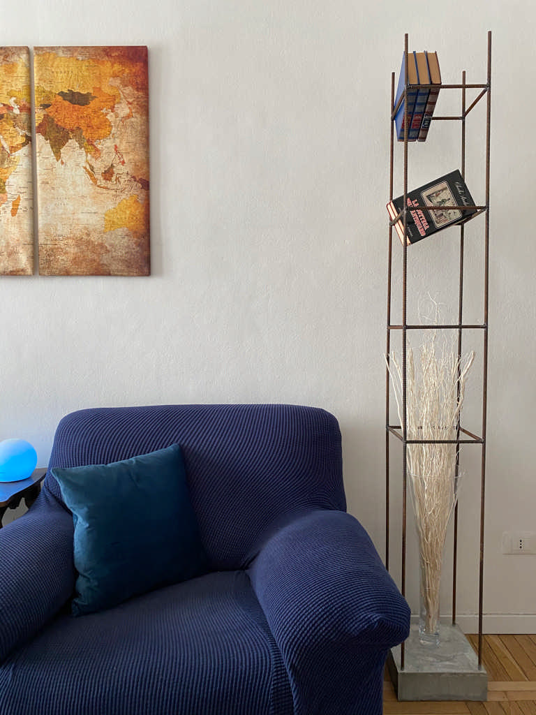 Libreria scultorea : una struttura ariosa e geometrica con ripiani inclinati che giocano con il concetto di movimento, rendendola funzionale e decorativa.